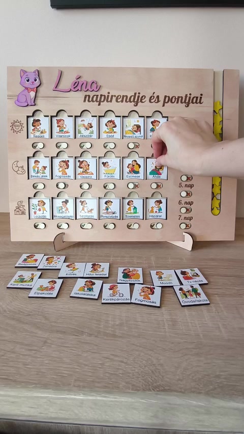 Napirend tervező tábla és pontgyűjtő gyerekeknek, fa napirend tervező