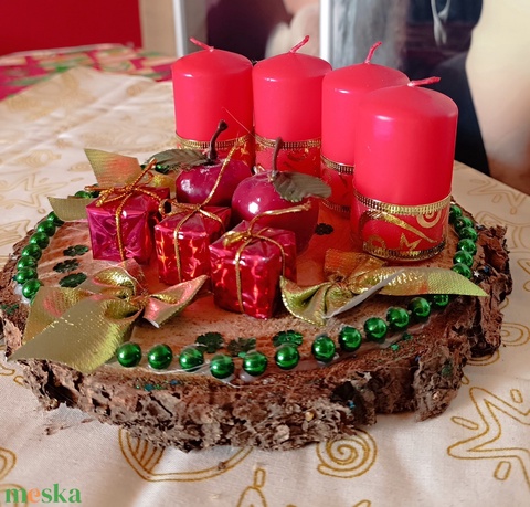 Adventi asztaldísz fakorongon 4 gyertyával a karácsony színeivel