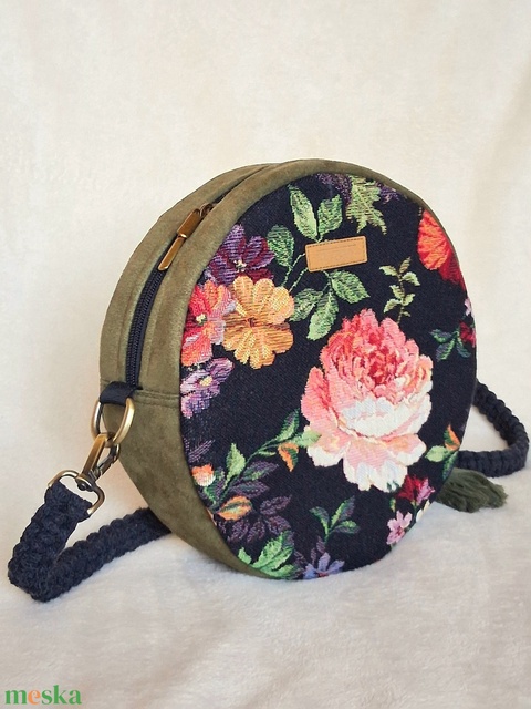 Zöld, rózsamintás körtáska, válltáska, valódi gobelin szövetből makramé vagy műbőr vállpánttal
