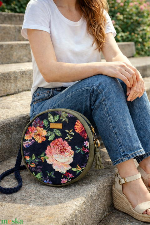 Zöld, rózsamintás körtáska, kőr alakú válltáska, valódi gobelin szövetből makramé vagy műbőr vállpánttal
