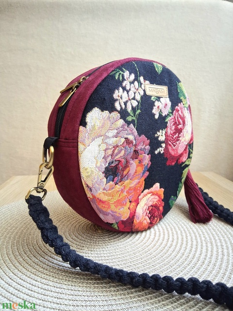 Bordó, rózsamintás körtáska, válltáska, valódi gobelin szövetből makramé vagy műbőr vállpánttal