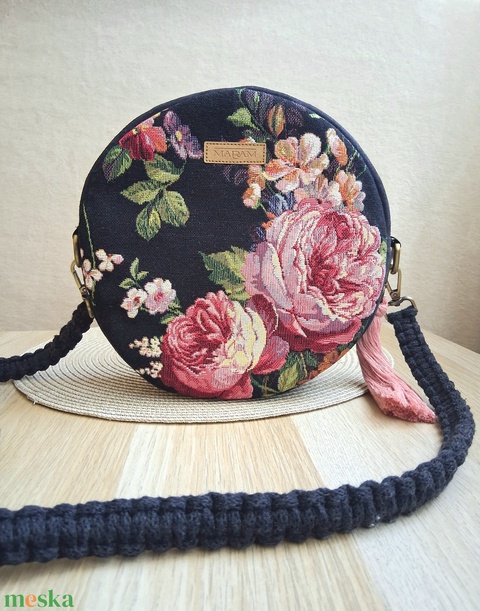 Fekete, rózsamintás körtáska, kőr alakú válltáska, valódi gobelin szövetből makramé vagy műbőr vállpánttal