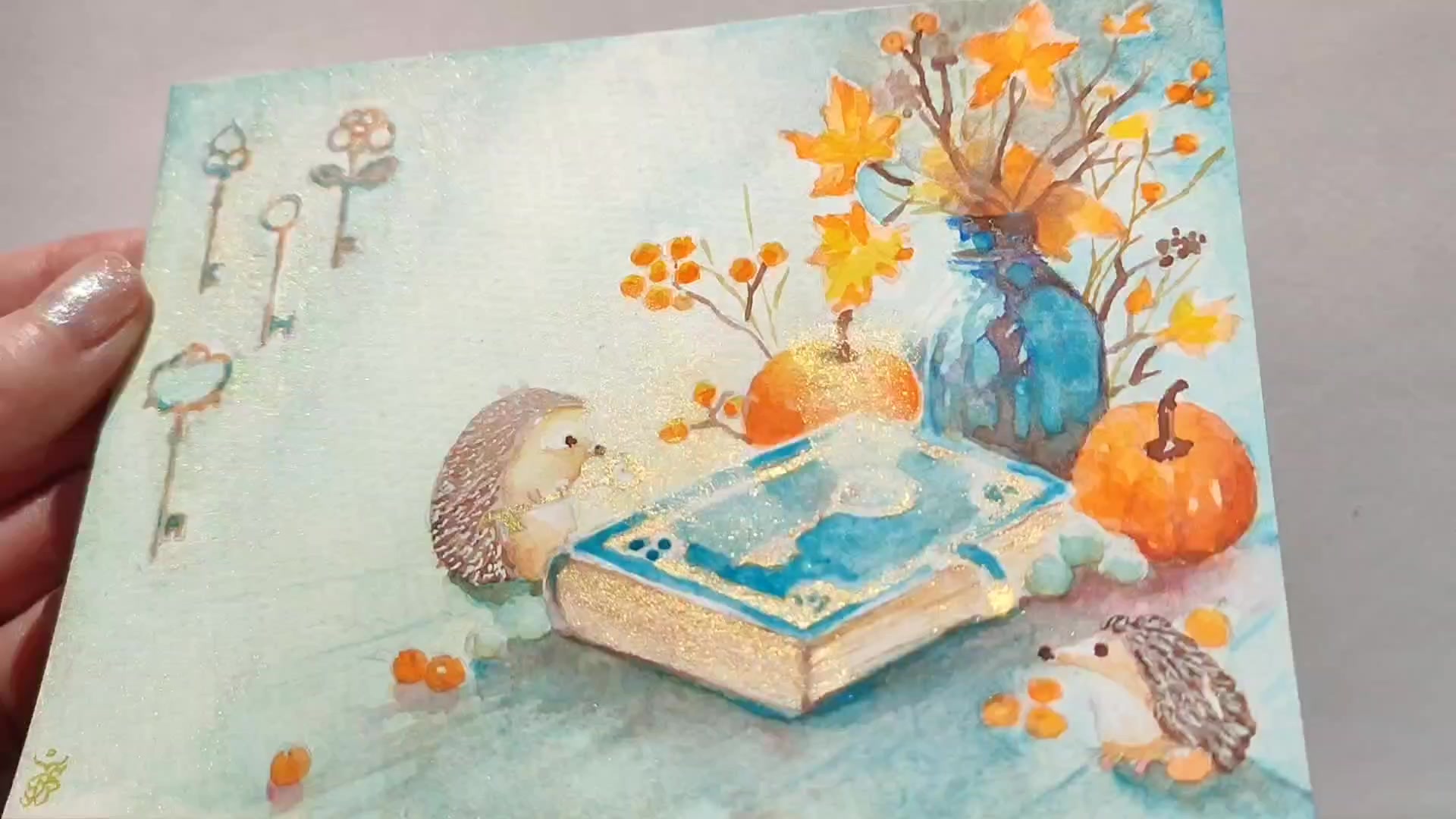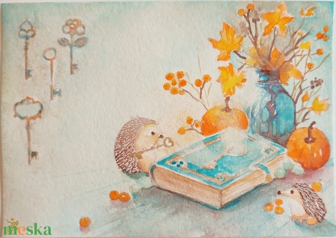 Eredeti akvarell őszi sünis-varázskönyves képeslap festmény