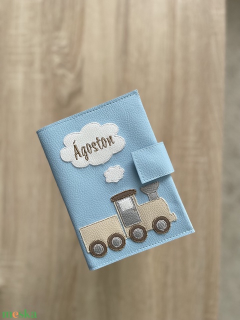 Világoskék alapon vonat mintás egészségügyi kiskönyv borító és irattartó műbőrből névhímzéssel