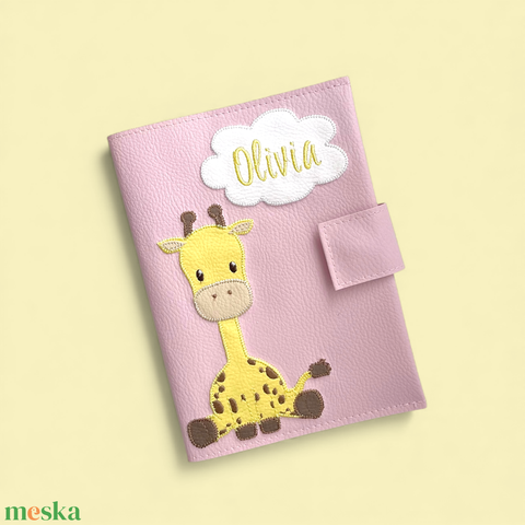 Púder alapon pasztell zsiráfos egészségügyi kiskönyv borító és irattartó névhímzéssel