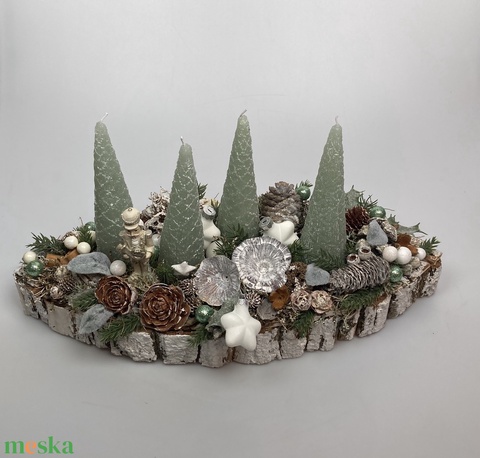 Diótörős, zöld fenyőfa gyertyás, cseppalakú alapzaton nyugvó, adventi asztaldísz gazdagon díszítve (AW3)