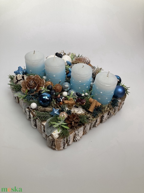Libikókázó gyerekekkel ékített, világoskék-fehér pöttyös gyertyás adventi asztaldísz gazdagon díszítve (AW4)
