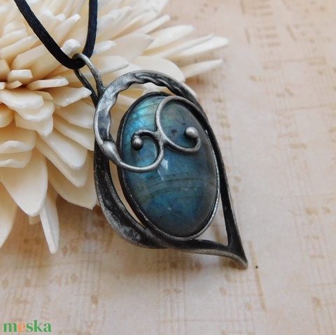 A medál Tiffany technikával készült labradorit, réz és ólommentes, ezüsttartalmú ón felhasználásával. A díszítés szintén saját készítésű, nem tartalmaz gyári elemeket. A fémrészt óezüstre patináztam és lelakkoztam, hogy sokáig szép maradjon.