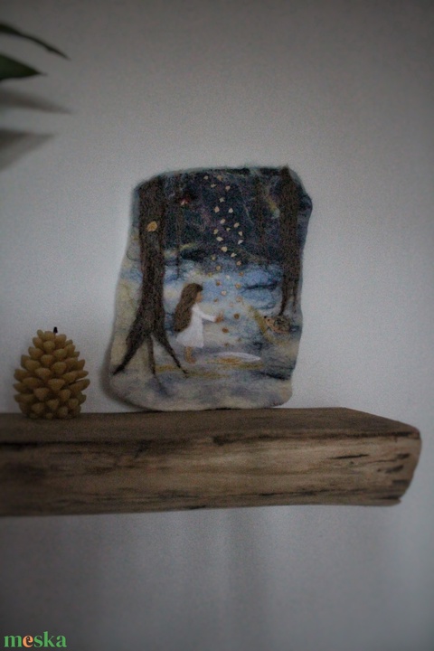 A csodálatos üzenetet hordozó Grimm-mese, a Csillagtallérok varázslatos jelenete mesél ezen a gyapjúképen. Aki ismeri vagy megismeri ezt a történetet és magával viszi mondanivalóját az életbe, az jobb emberré vállhat. Vegyétek a kezetekbe, tapogassátok a gyapjú nyugtató puhaságát és meséljétek el a kislány történetét. Szép kapcsolódás és közös élmény lesz. A mesekép alapját vizes nemezeléssel-, a témáját pedig tűnemezeléssel alkottam meg. Minden részlete kézimunka és magas minőségű gyapjúból van. Mérete kb.20x25cm - nemezelés közben a gyapjú zsugorodása miatt picit változhatnak a paraméterek. A kép falra akasztható.
