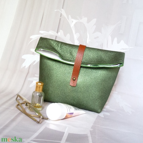 Olasz borjúbőr sminktáska, Kozmetikai táska, Zöld metálfényű bőr szemüvegtartó, Tolltartó