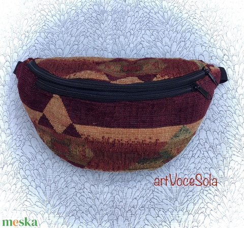 - Anyaga: hevederpánt, műanyagcsat, cipzár, dekorszövet, bélés selyem