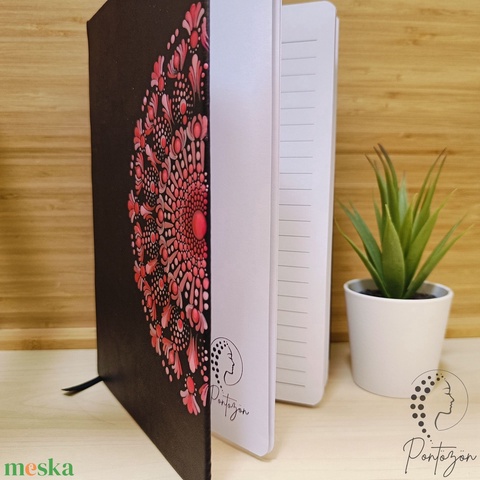 Fekete A5 méretű, vonalas, kemény fedeles jegyzetfüzet magenta és rózsaszín pontozott mintával a borítón