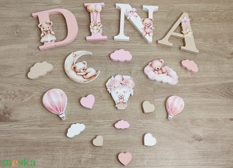 Rózsaszín-bézs macis dekorbetű szett, választható névvel, színnel, kézműves, dekoráció, név, betű, dekor betű
