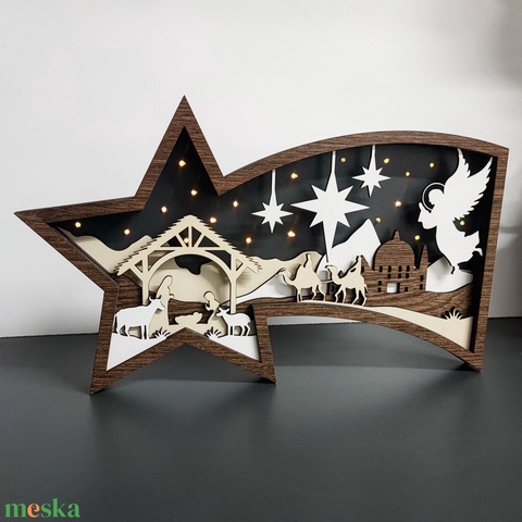 Varázslatos karácsonyi hangulatot teremt ez a különleges csillag formájú fa dekoráció, amely finom részletességgel ábrázolja a betlehemi jelenetet.