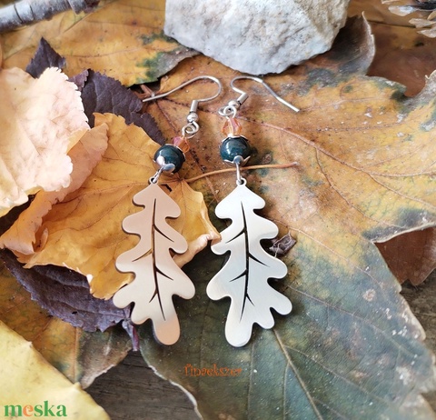 Tölgyfa levél acél fülbevaló - zöld heliotróp ásvány, narancssárga üveggyöngy