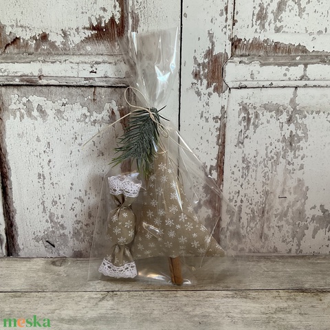 - Anyaga: pamutvászon, fahéj, csipke