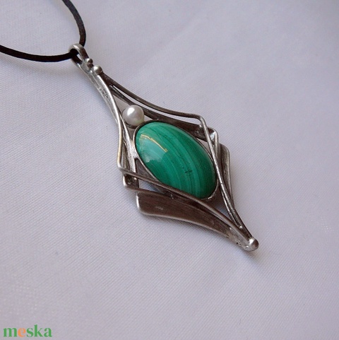 A medál tiffany technikával készült malachit és ólommentes, ezüsttartalmú ón felhasználásával. A díszítés szintén saját készítésű, nem tartalmaz gyári elemeket. A fémrészt óezüstre patináztam, lekezeltem antioxidánssal és lelakkoztam, hogy sokáig szép maradjon.