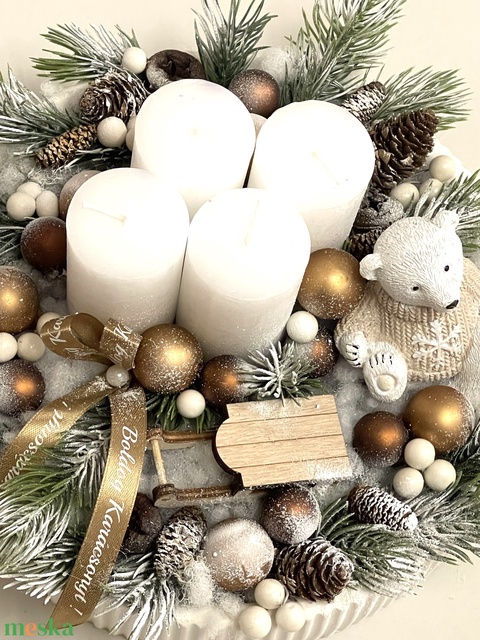 gipszkaspó, gyertya, kerámiafigura, műfenyő, gömb