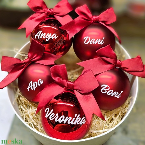 Piros üveggömb szett 5db 8cm egyedi felirattal, családi csomag, gömbbox (805gombbox)