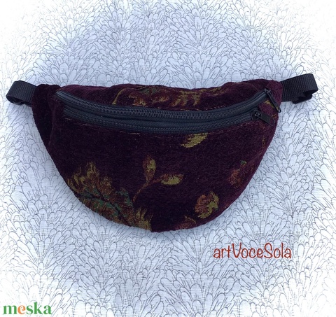 - Anyaga: hevederpánt, műanyagcsat, cipzár, dekorszövet, bélés selyem