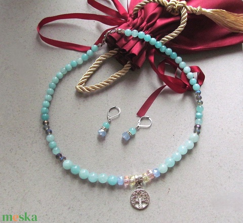 - Anyaga: természetes amazonit ásványgyöngy (8 mm és 6 mm), üvegkristály gyöngy, rozsdamentes acél (antiallergén, vízálló), rozsdamentes acél fülbevaló, delfinkapocs