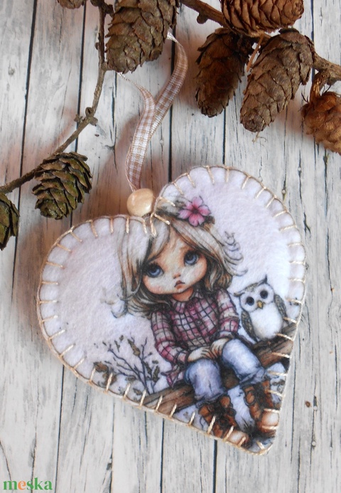 Szőke kislány bagollyal 1. / Vintage stílusú szív alakú karácsonyfadísz