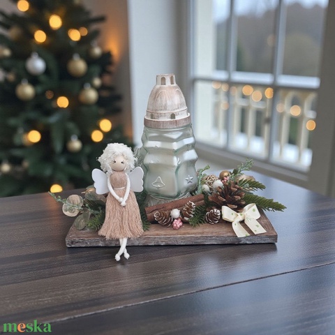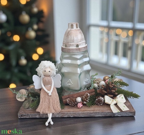 Kültéri karácsonyi asztaldísz - makramé angyallal, mécsessel és természetes színekben, arany csillogással