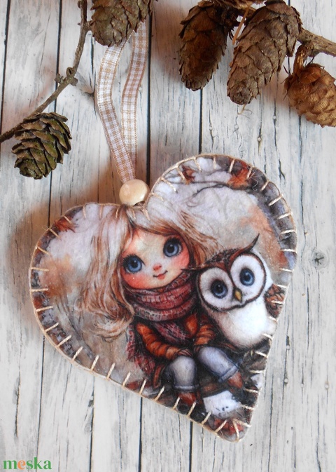 Szőke kislány bagollyal 5. / Vintage stílusú szív alakú karácsonyfadísz