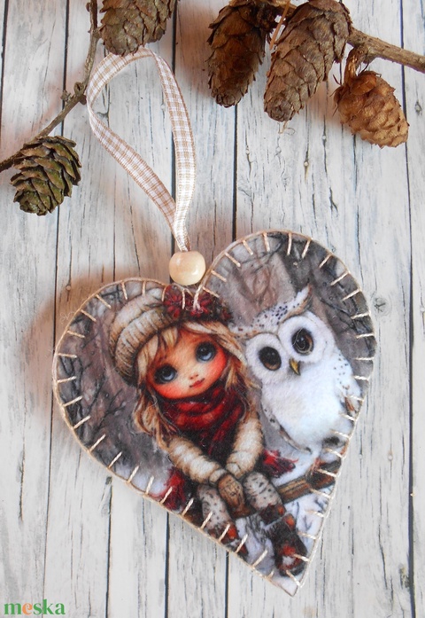 Szőke kislány bagollyal 8./ Vintage stílusú szív alakú karácsonyfadísz