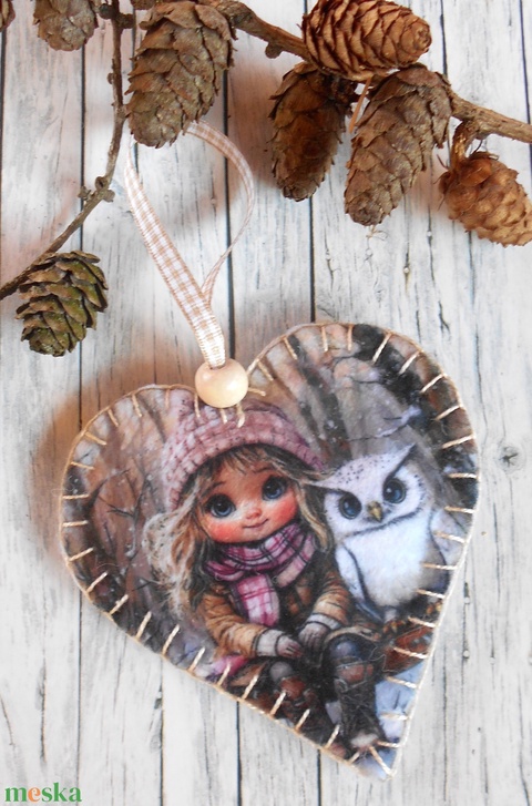 Szőke kislány bagollyal 9./ Vintage stílusú szív alakú karácsonyfadísz