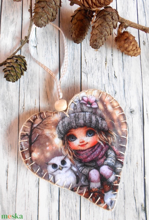 Szőke kislány bagollyal 10./ Vintage stílusú szív alakú karácsonyfadísz