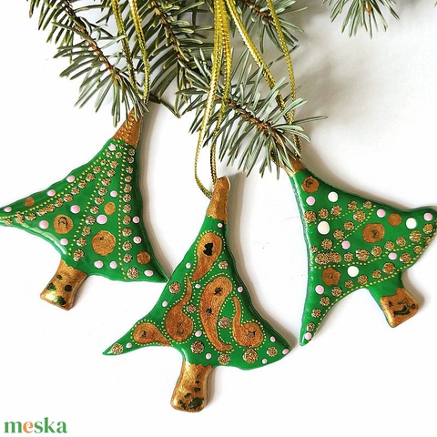 Keleties fenyőfák, arannyal díszített üveg karácsonyfadíszek