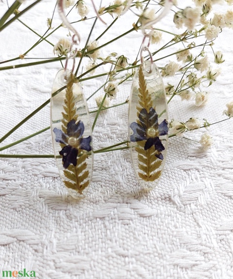 Páfrányos fülbevaló. Átlátszó gyanta ékszer. Természetes, botanikai ajándék. Kék virágos óvális fülcsi.