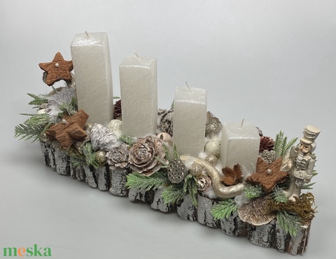 Diótörő figurával ékesített, selyemfényű, fehér, orgonasípszerűen csökkenő méretű gyertyás adventi asztaldísz (AW9)