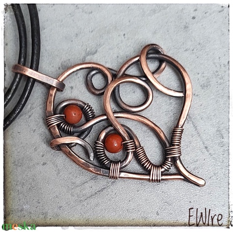 Szív medál, vörösréz szív vörös jáspissal, drótszív, drótékszer