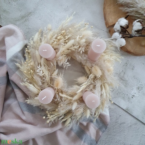 Pampafű adventi koszorú szárazvirágokkal, termésekkel kiegészítve