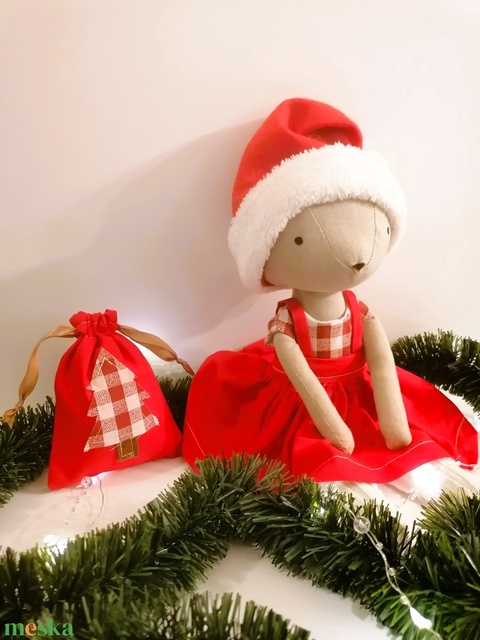 Egérke Mikulás ruhában, ajándék zsákkal- készségfejlesztő, textil gyermek játék