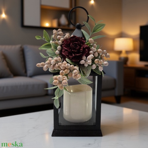 Elegáns téli led lámpás bordó virággal – meghitt fények az otthonodba