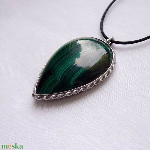 A medál tiffany technikával készült malachit és ólommentes, ezüsttartalmú ón felhasználásával. A díszítés szintén saját készítésű, nem tartalmaz gyári elemeket. A fémrészt óezüstre patináztam, lekezeltem antioxidánssal és lelakkoztam, hogy sokáig szép maradjon.