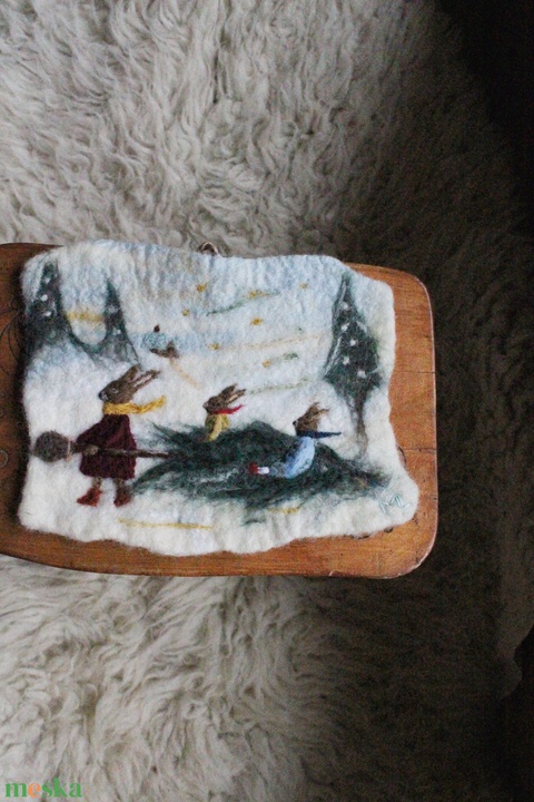 A karácsony egyik legszebb eseménye az illatos ünnepi fenyő beszerzése. A nyúl anyuka két kis gyermekével indult el a hófedte úton, hogy mókásan beszerezzék a karácsonyfát. Vegyétek kezetekbe ezt a puha, minőséges gyapjúból nemezelt képet és meséljetek a karácsony csodákkal teli időszakáról. Ha befejeztétek a mesét, a nemezképet felakaszthatjátok a gyerekszoba falára.
