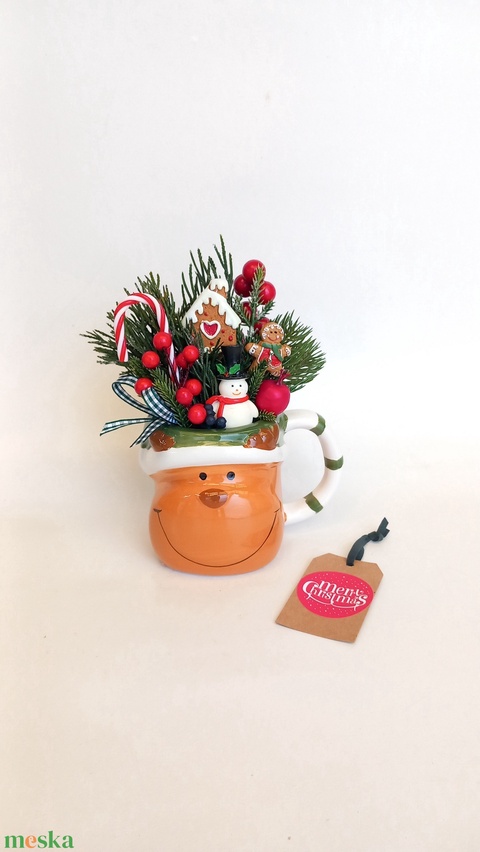 - Anyaga: tűzőhab, műnövények, műbogyók, szalag, karácsonyidekorációk, kártya, bögre