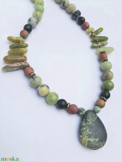 - Anyaga: nefrit jáde, damil, fagyos üveggyöngyök, fém szerelékek, apró üveggyöngyök