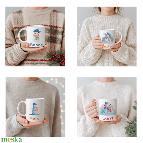 Névre szóló Hóemberes bögre – vízfesték hatású karácsonyi minta, 3 dl