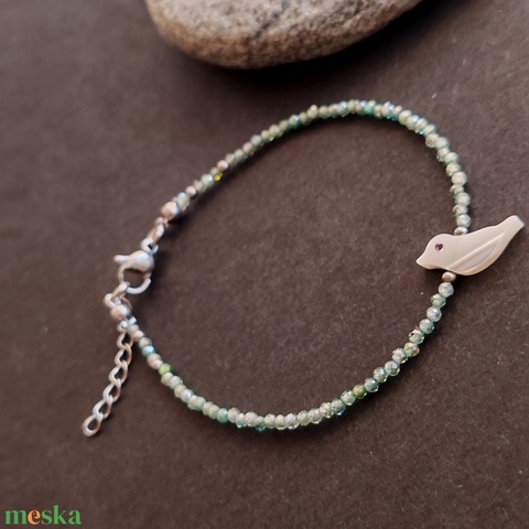 nemesacél szerelék, sodrony, kapocs / zsinór, cirkónia, gyöngyház madár