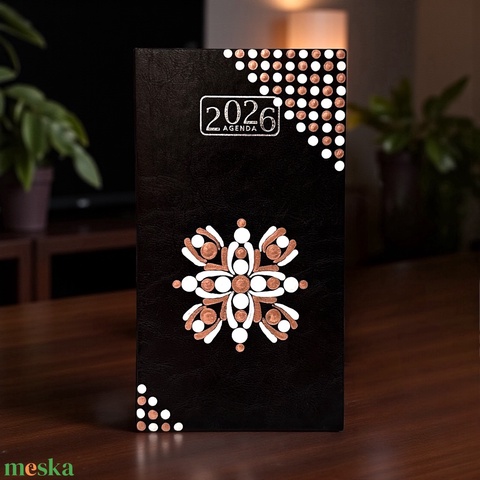 2026. évi fekete műbőr zsebnaptár rosegold és fehér színű pontmandalával 9,5x17 cm
