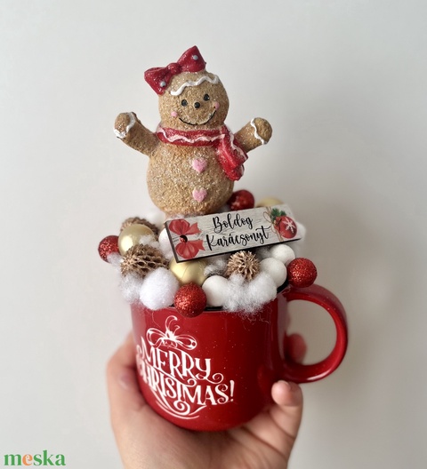 Piros fehér karácsonyi asztaldísz bögrében mézeskalács figurával