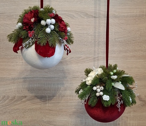 - Anyaga: hungarocell, bársony, szalag, virágok, bogyók, zöldág, akril, gyöngyök, levelek, eukaliptusz
