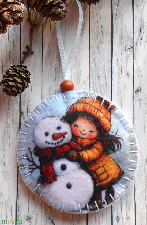 Kislány hóemberrel 8.kör alakú karácsonyfadísz