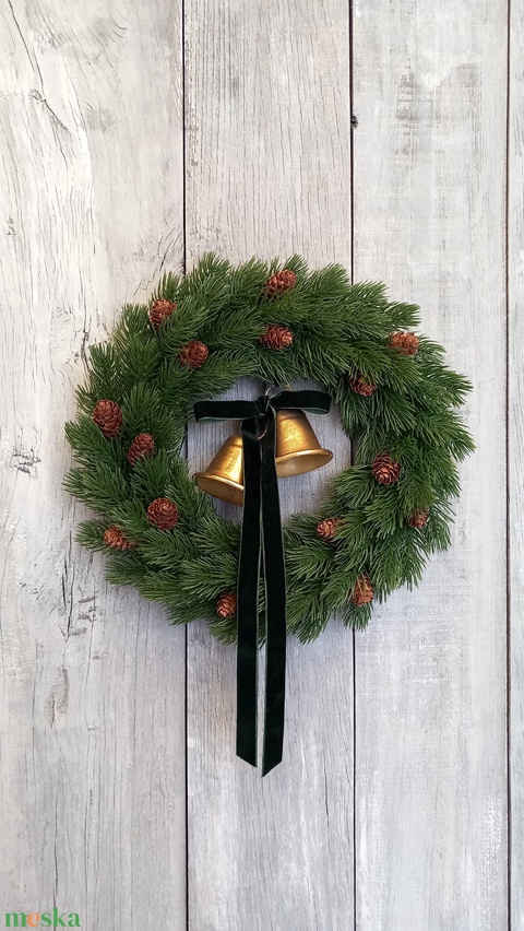 szalag, fémharangok, vesszőalap, műzöldek, termések