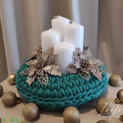 Adventi koszorú - horgolt zöld alap, arany disszel